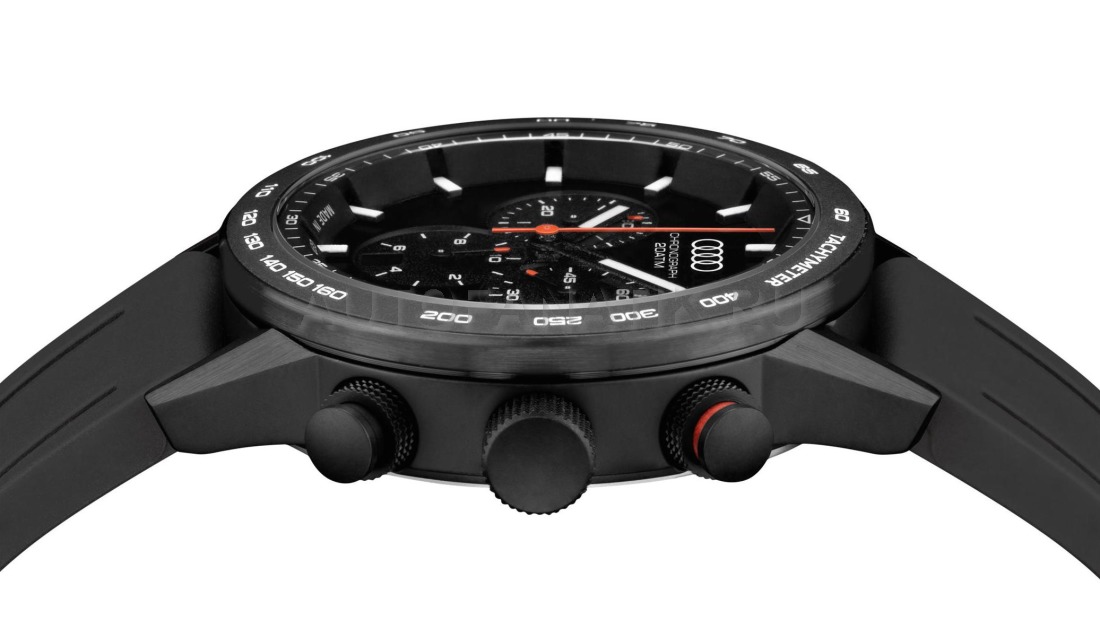 - Кварцевый механизм Ronda 5040.D - Черный корпус из нержавеющей стали 316L с IP-покрытием - Завинчивающаяся заводная головка и задняя крышка корпуса - Фиксированный керамический безель матово-черного цвета с тахиметром - Одностороннее антибликовое сапфировое стекло - Матово-черный циферблат - Люминесцентные стрелки и индексы Super-LumiNova - Функции: хронограф, центральная секундная стрелка, от 1/10 секунды до 30 минут, 30-минутный счетчик, 10-часовой счетчик, функция сложения и разделения, малая секундная стрелка, индикация даты - Водонепроницаемость до 20 ATM - Кольца Audi на циферблате